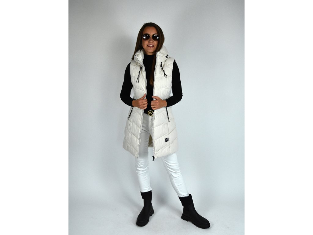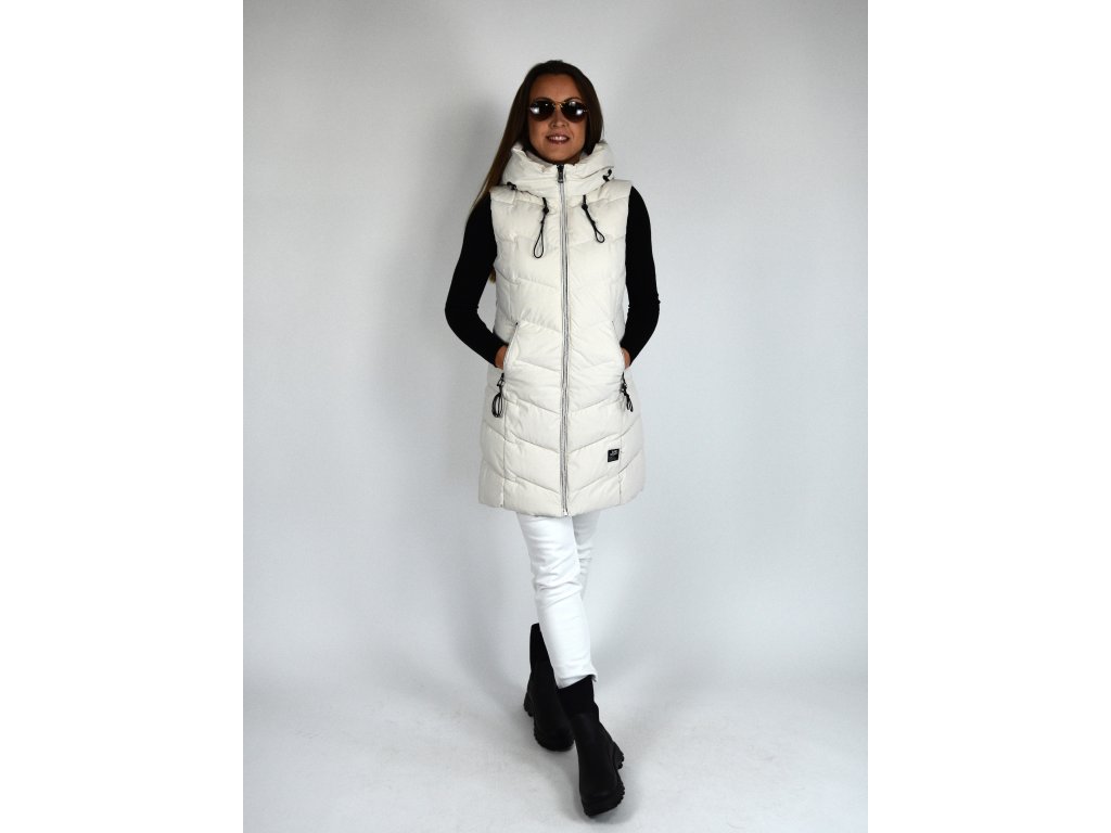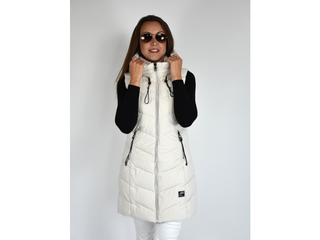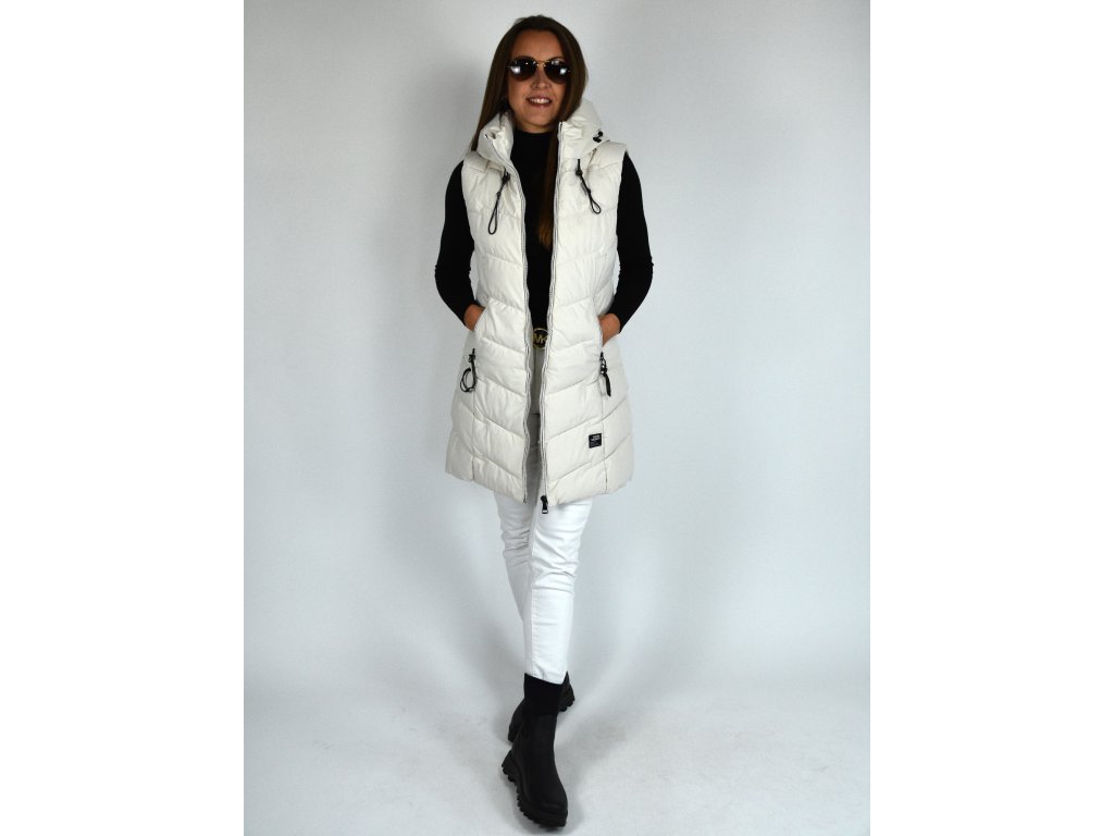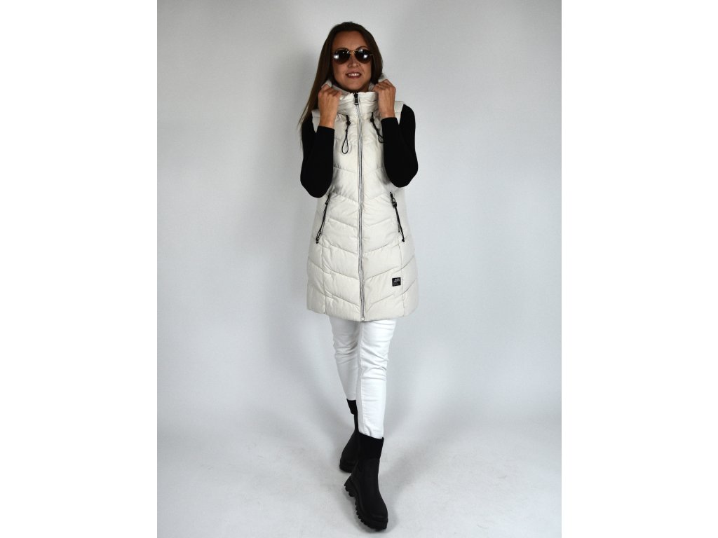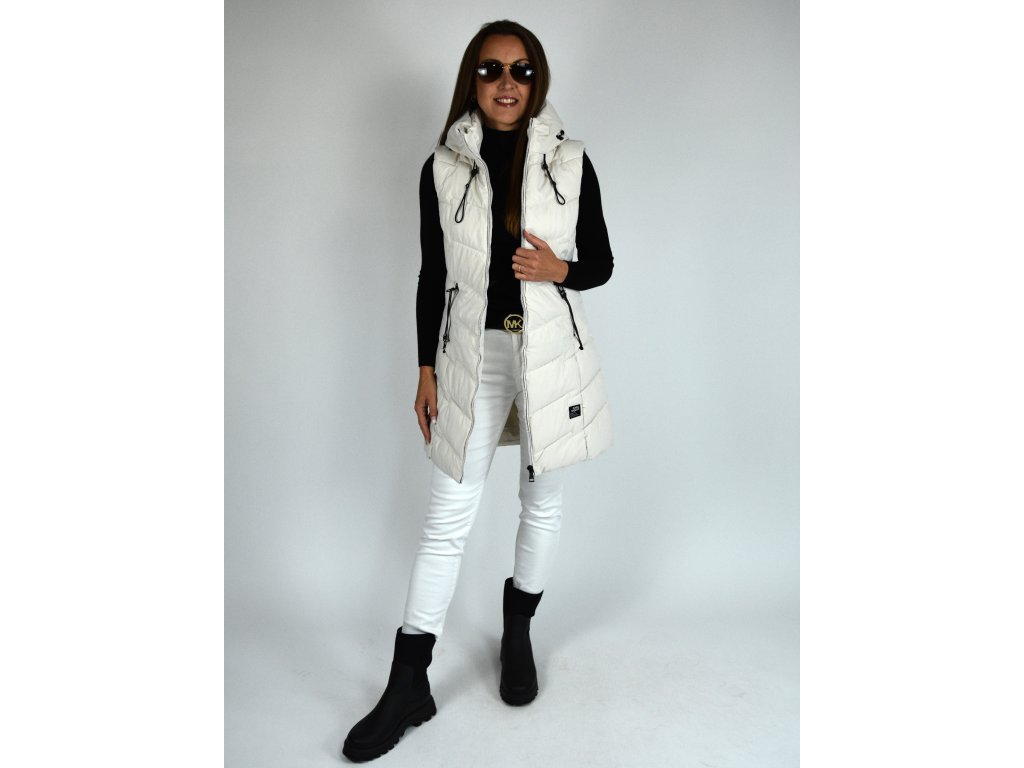 Béžová dlouhá prošívaná vesta s kapucí 48042