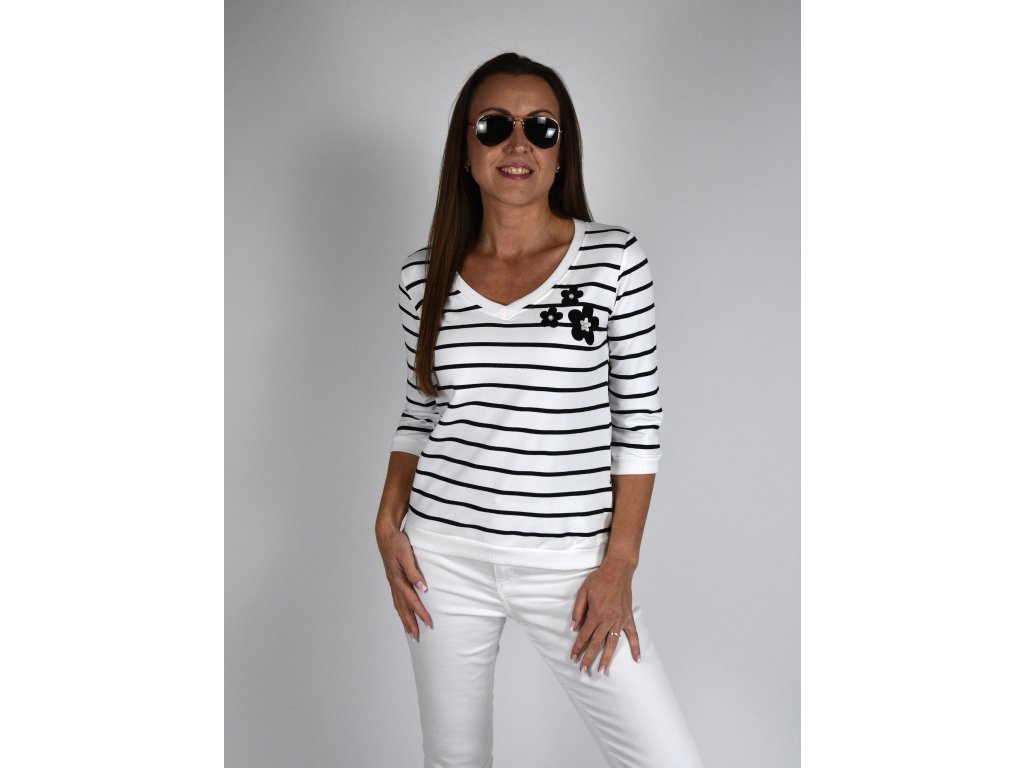 Bílá mikina s véčkovým výstřihem Megi, černé proužky B2271