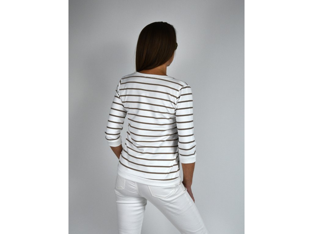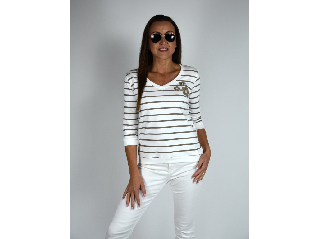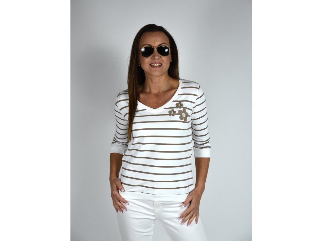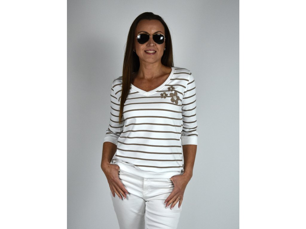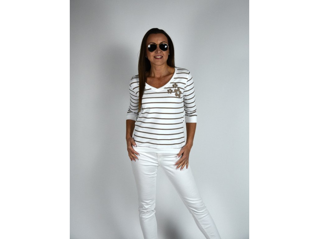 Bílá mikina s véčkovým výstřihem Megi, světle hnědé proužky B2271