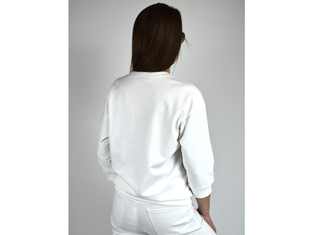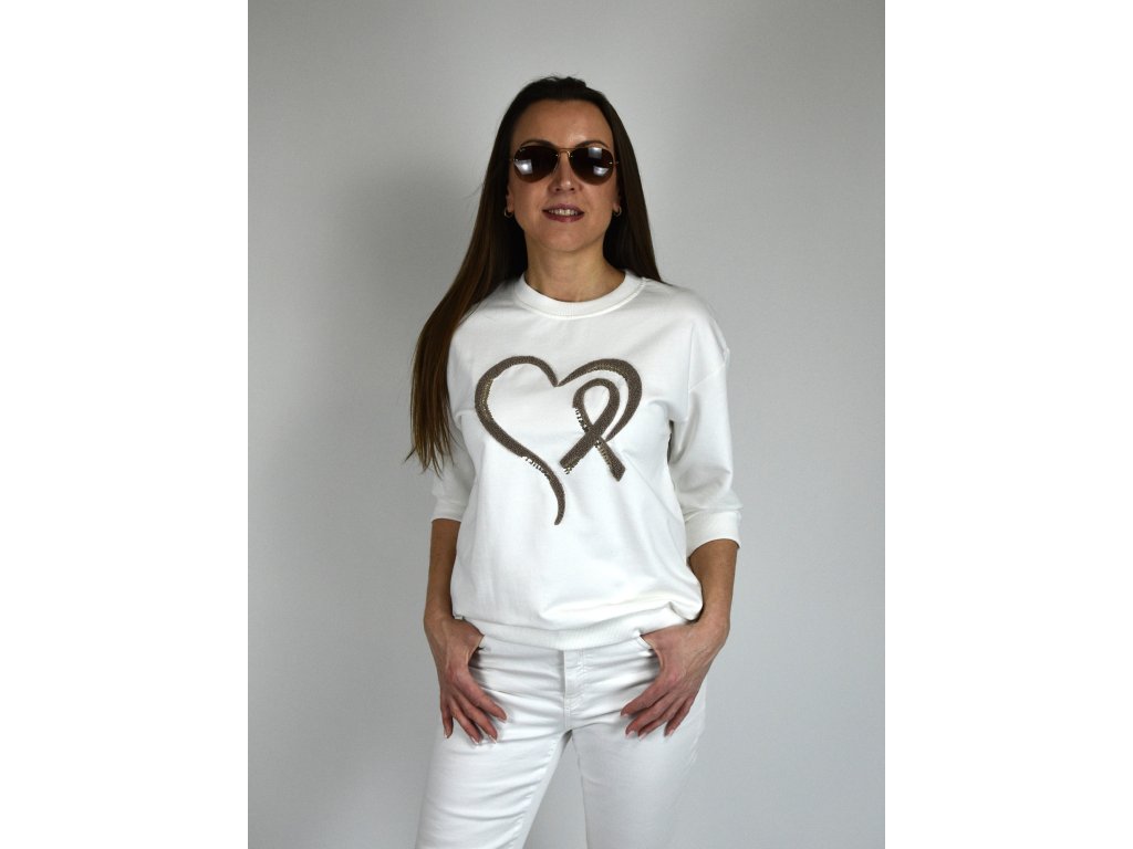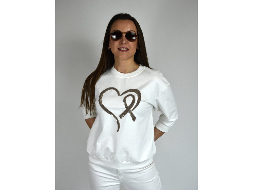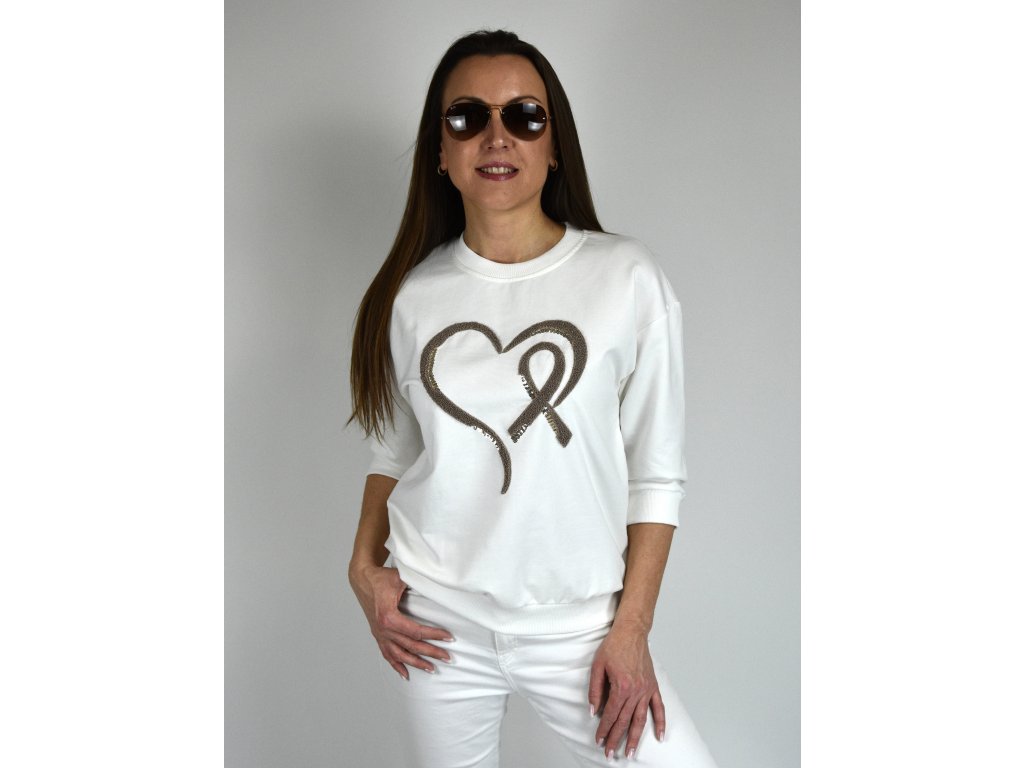 Stylová dámská mikina v bílé barvě. Dominantou je originální srdce na přední straně, kombinující jemnou strukturu a decentní lesk flitrů.