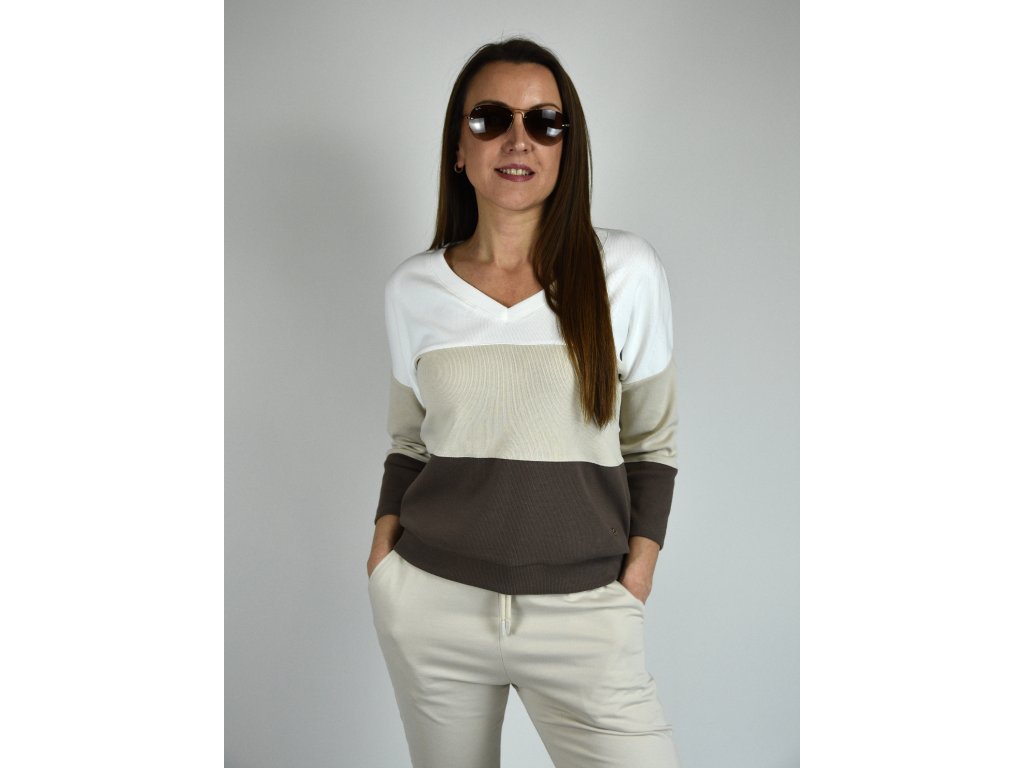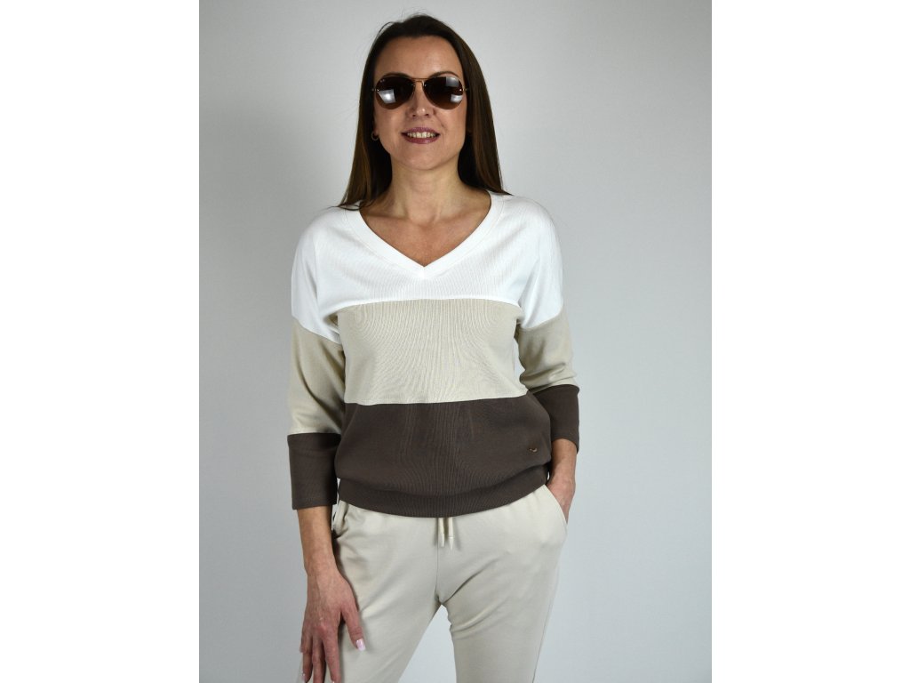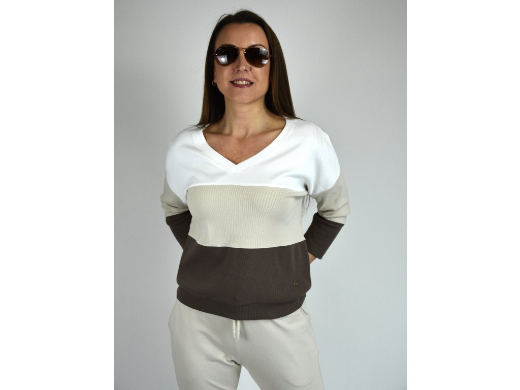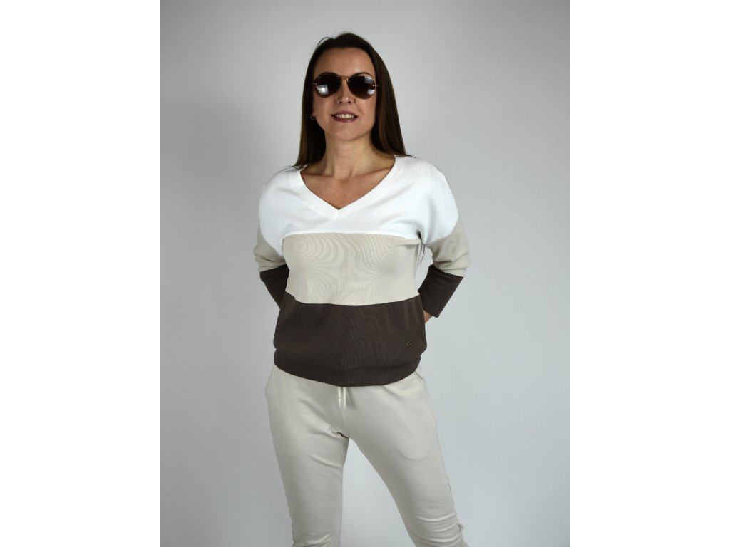Bílo-hnědé tričko s véčkovým výstřihem B1381
