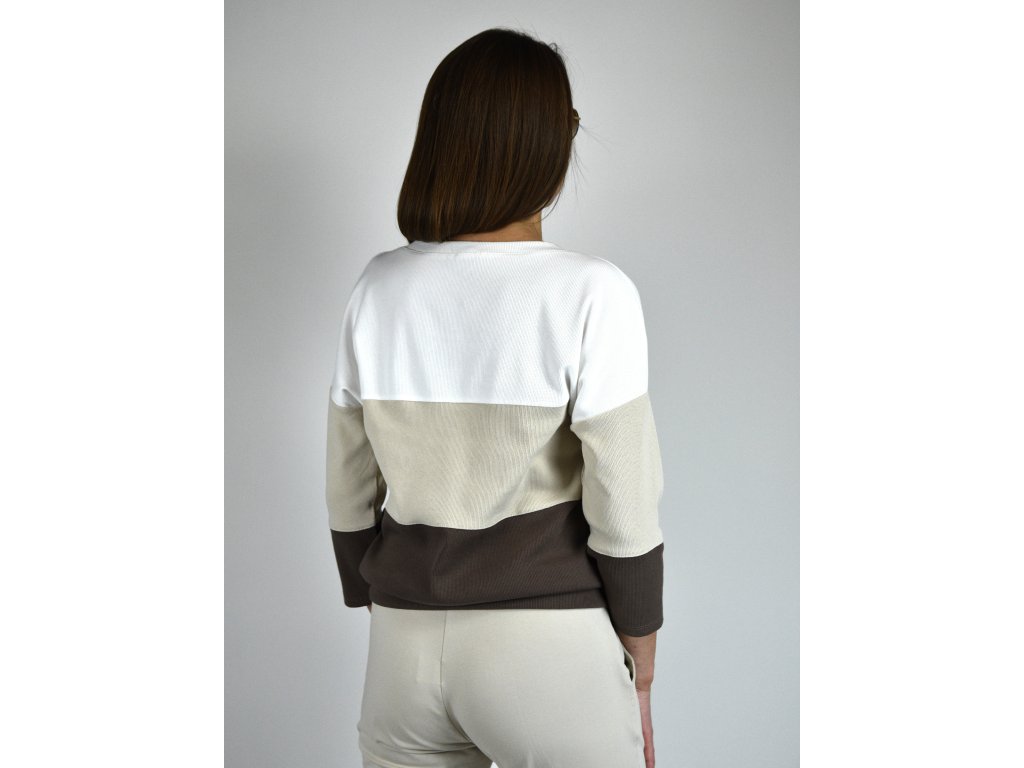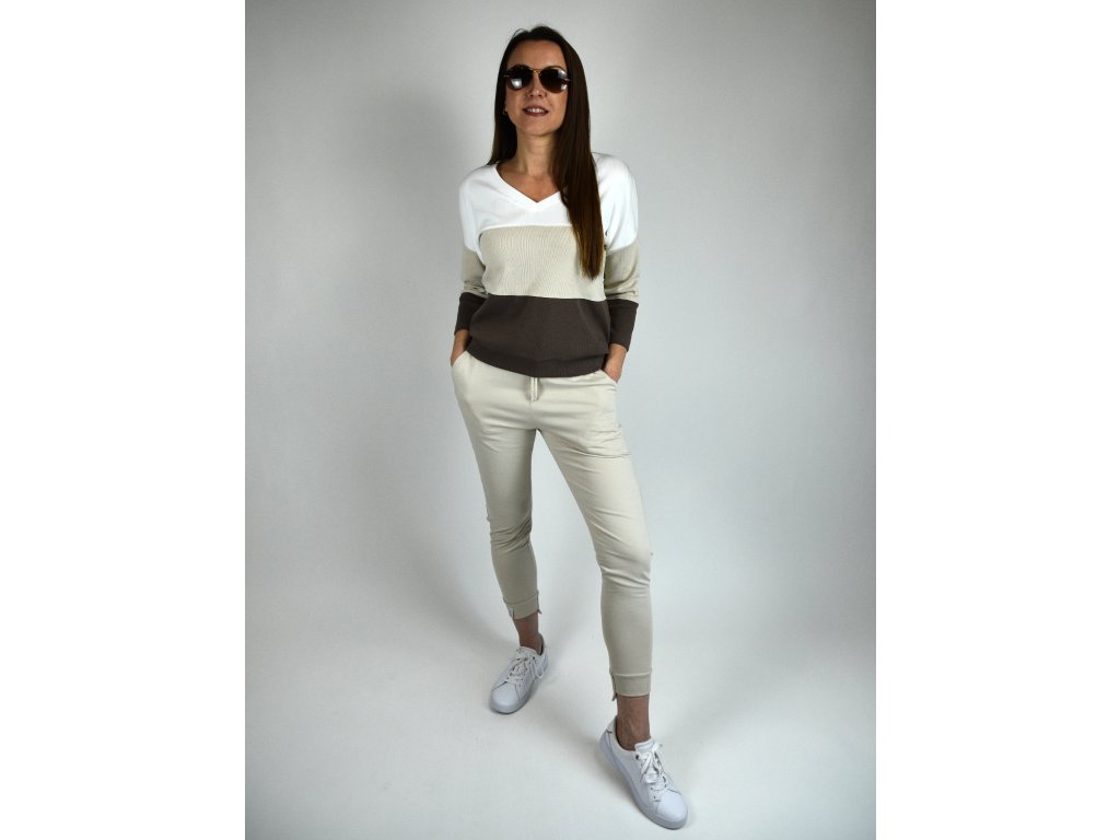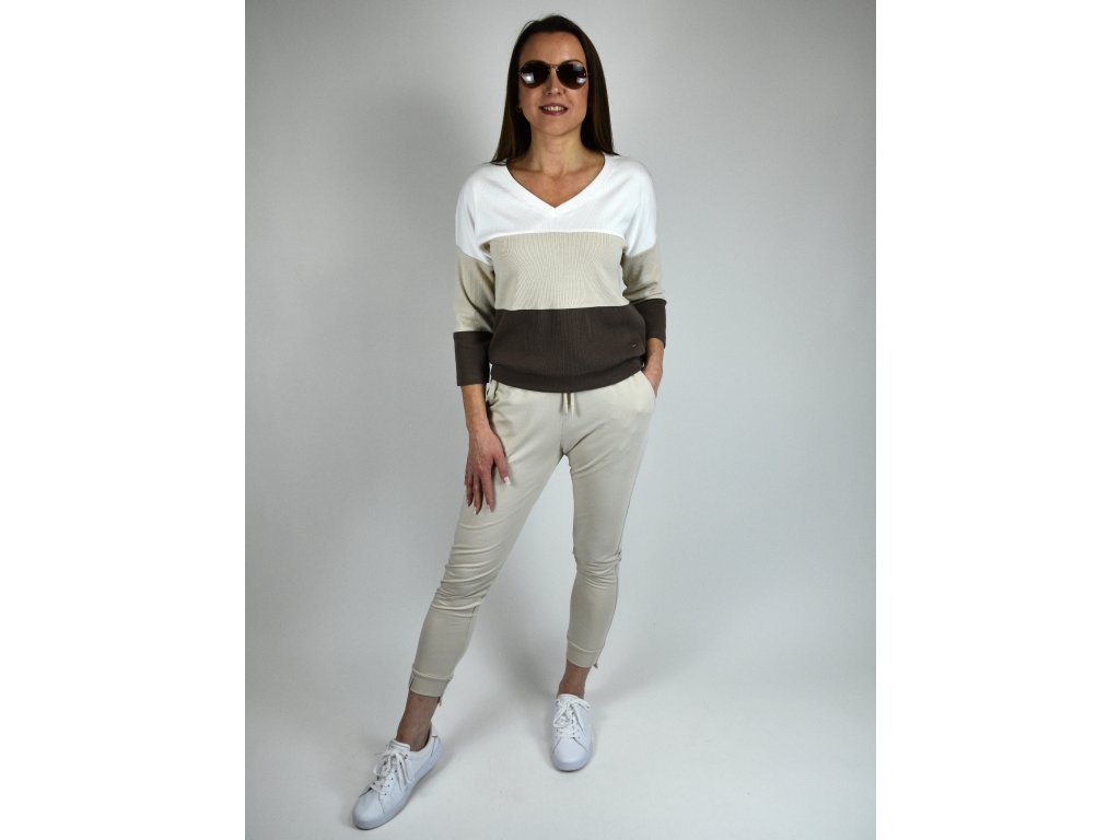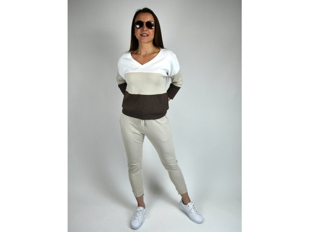 Bílo-hnědé tričko s véčkovým výstřihem B1381