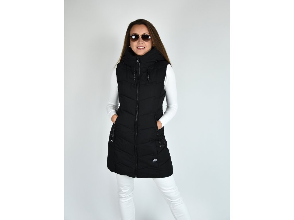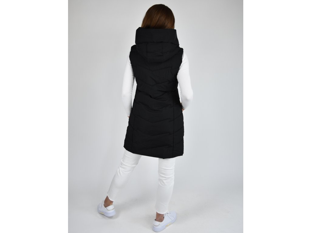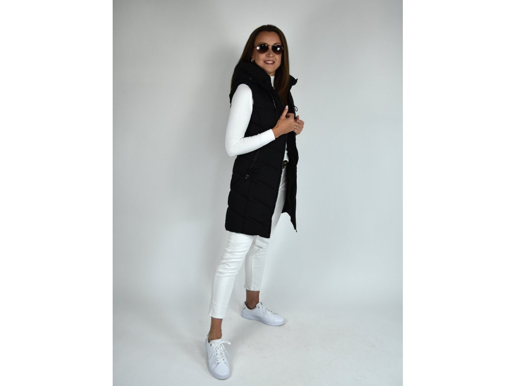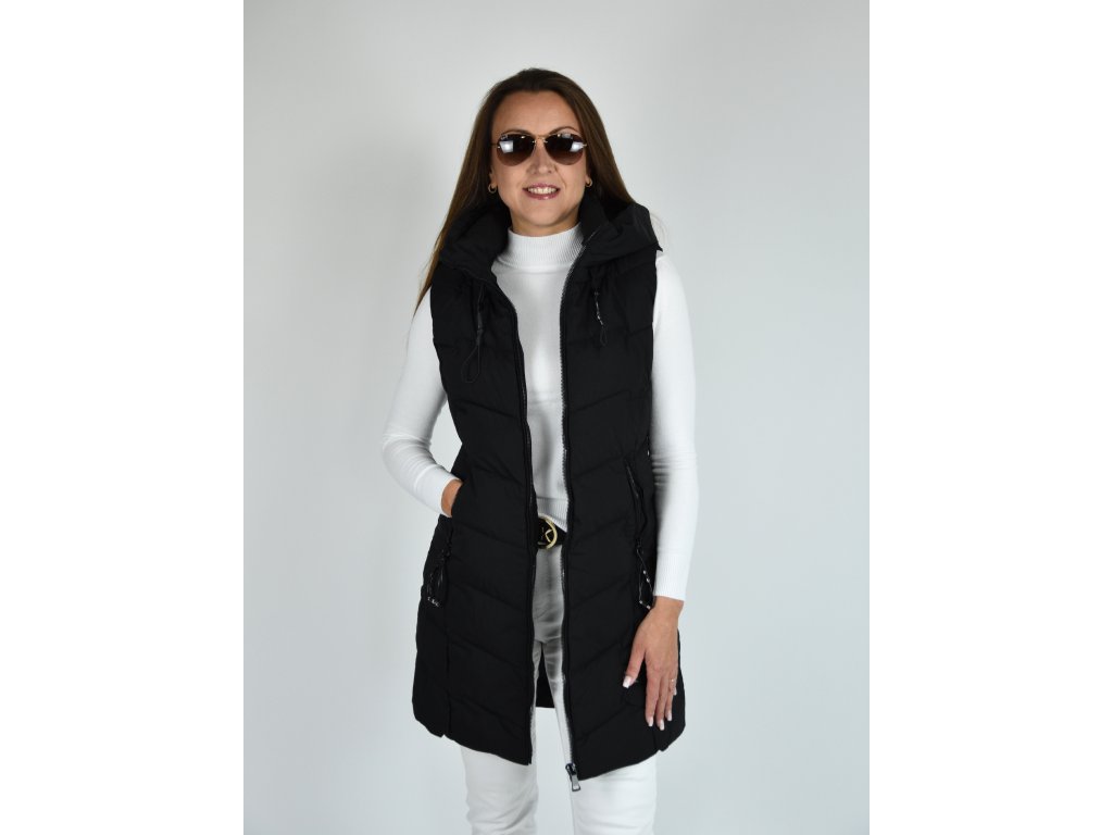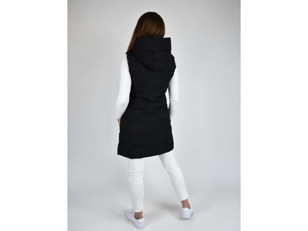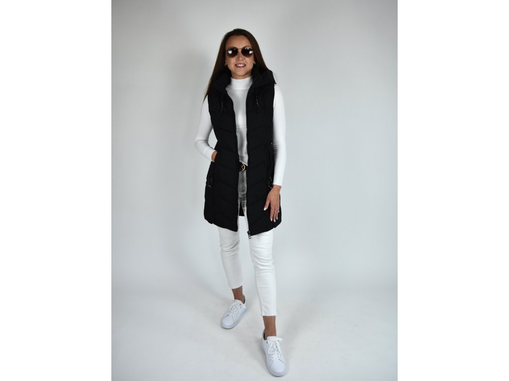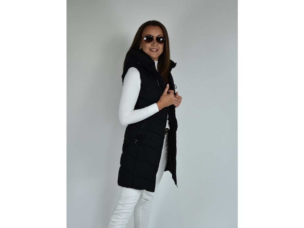 Černá dlouhá prošívaná vesta s kapucí 48042