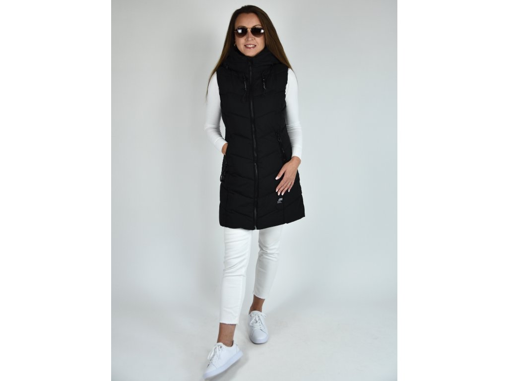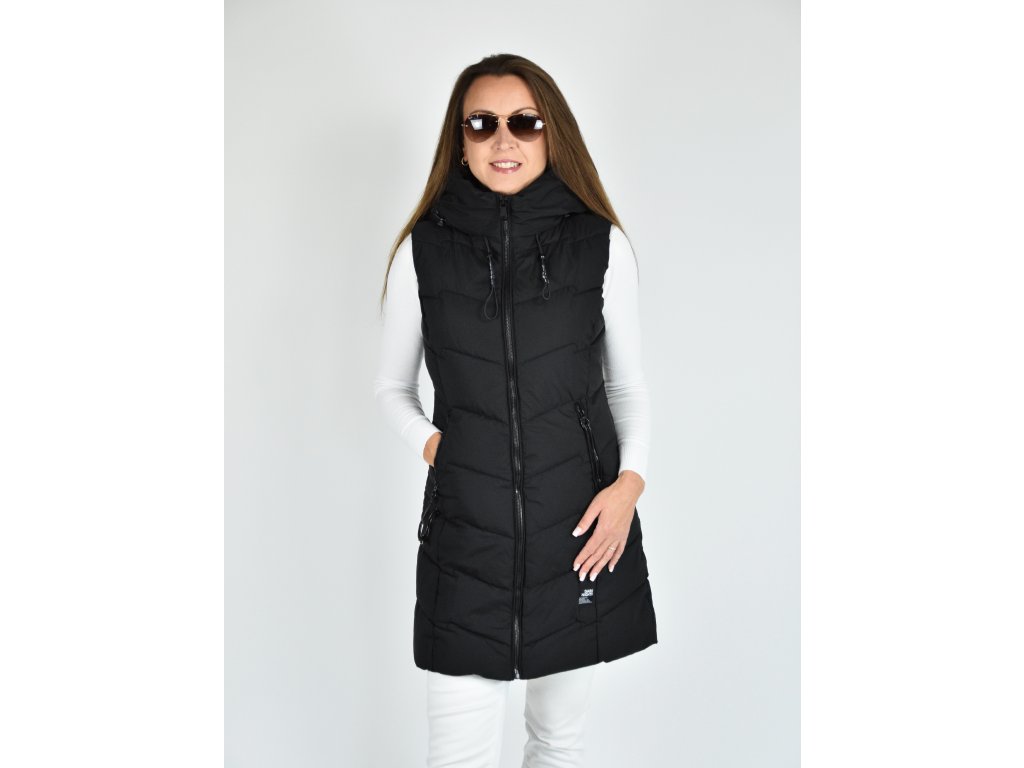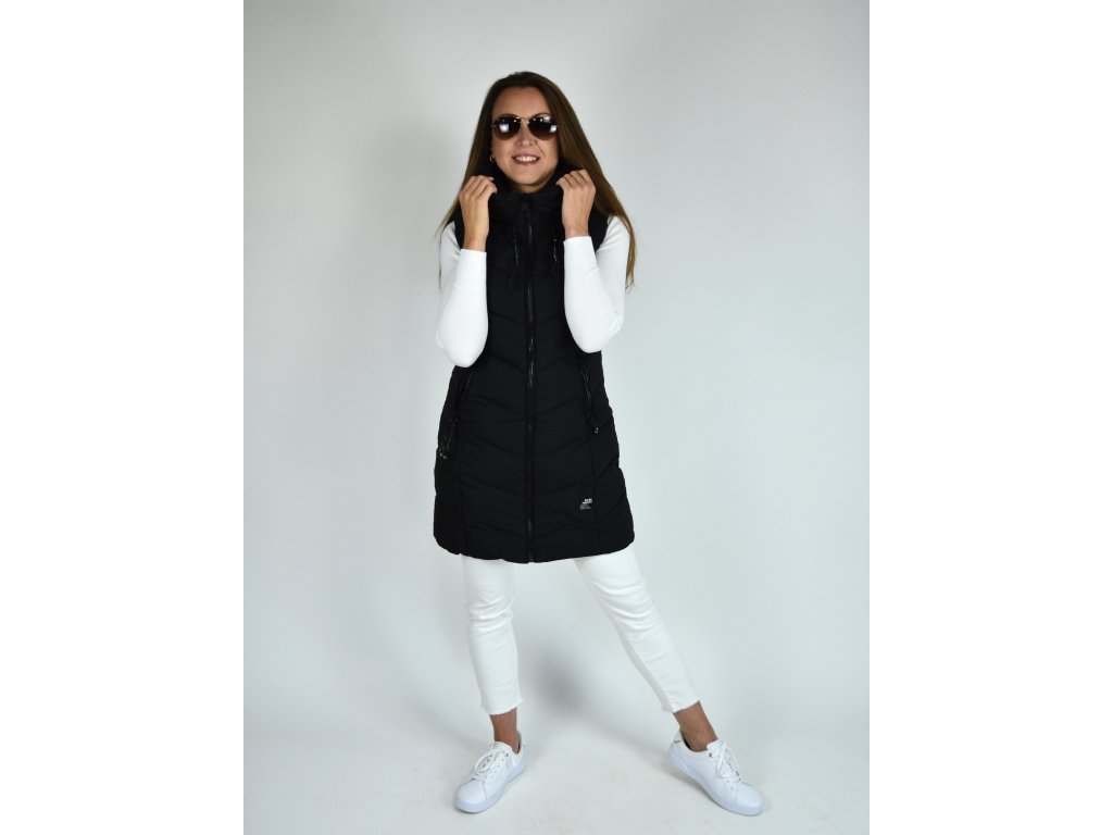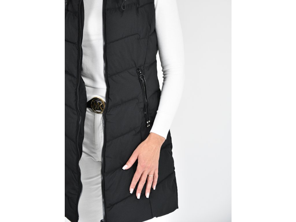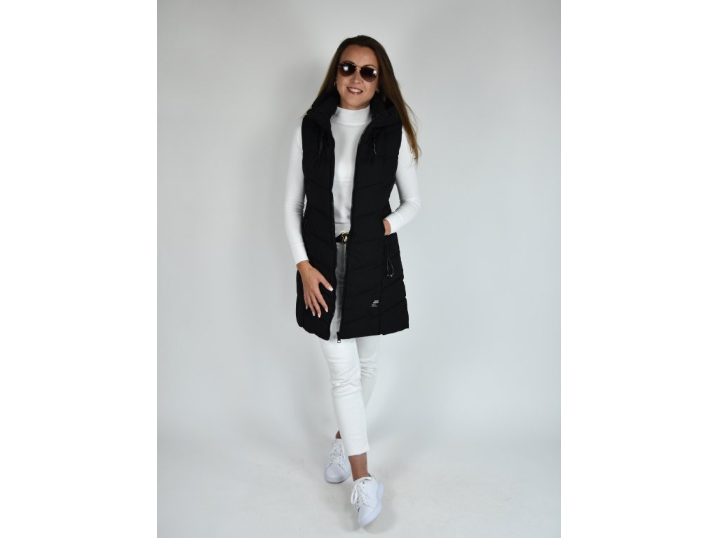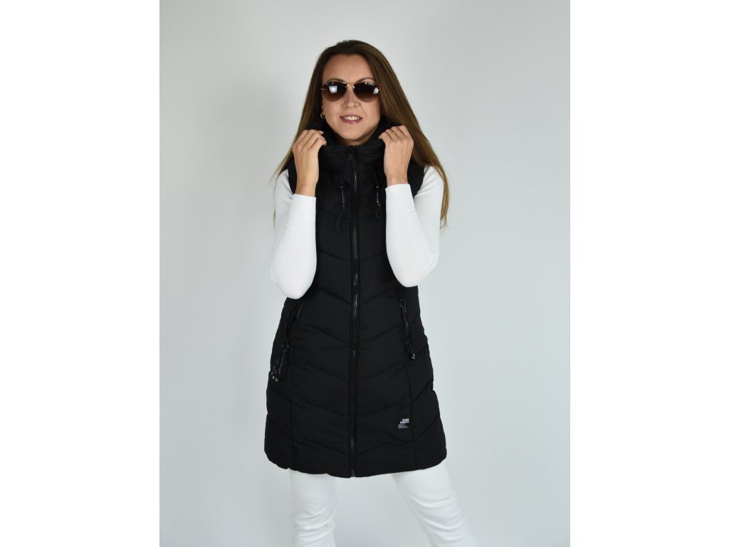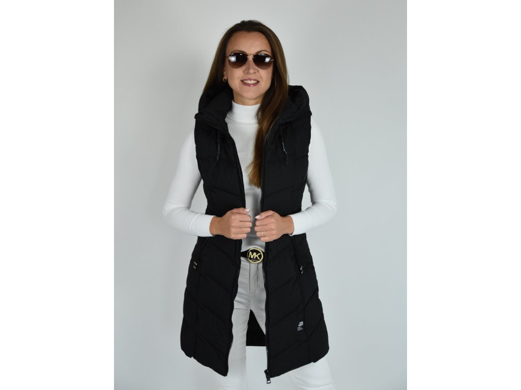 Černá dlouhá prošívaná vesta s kapucí 48042
