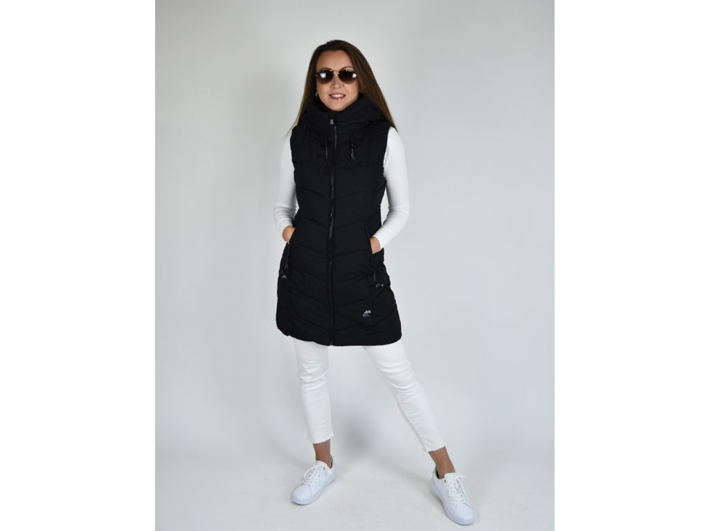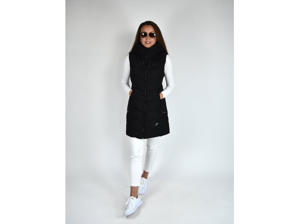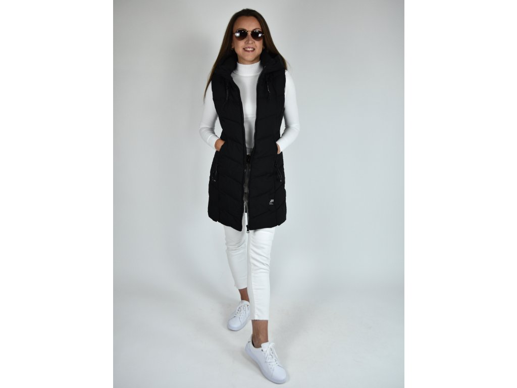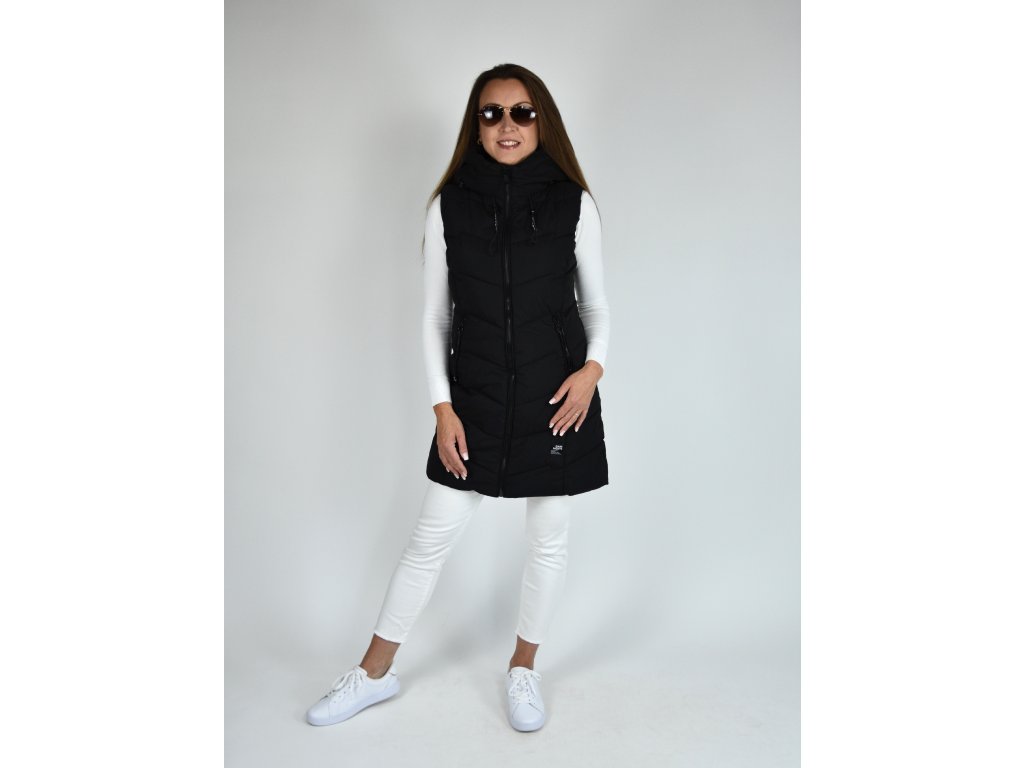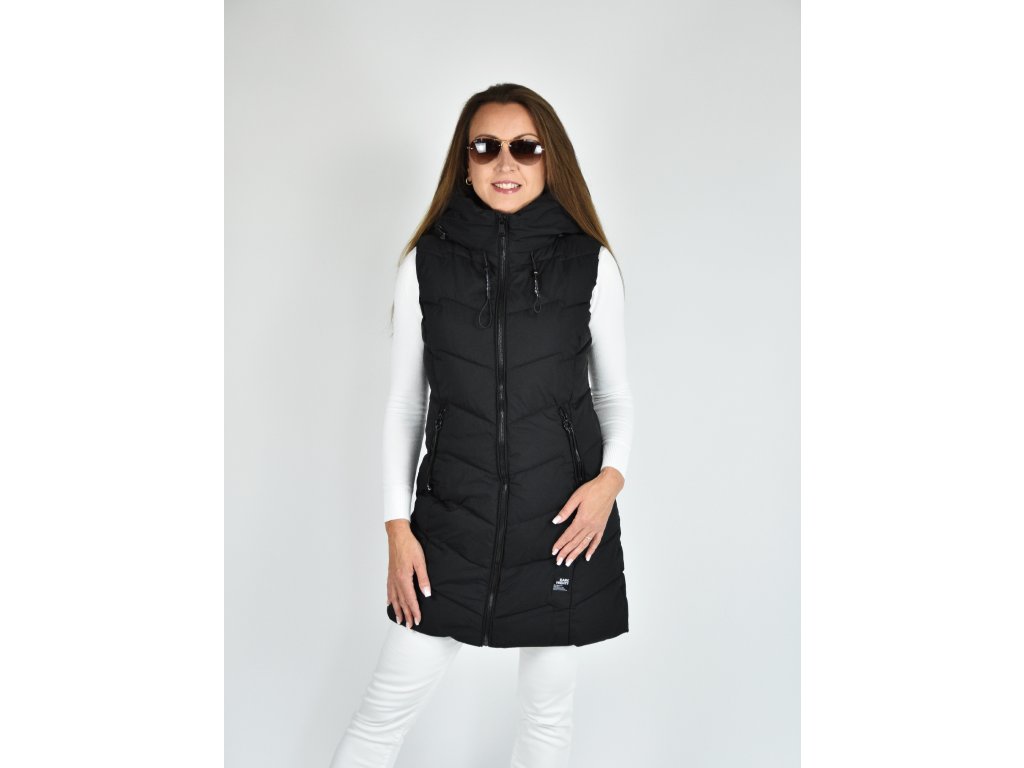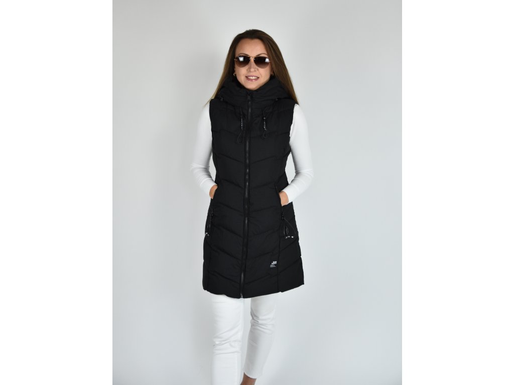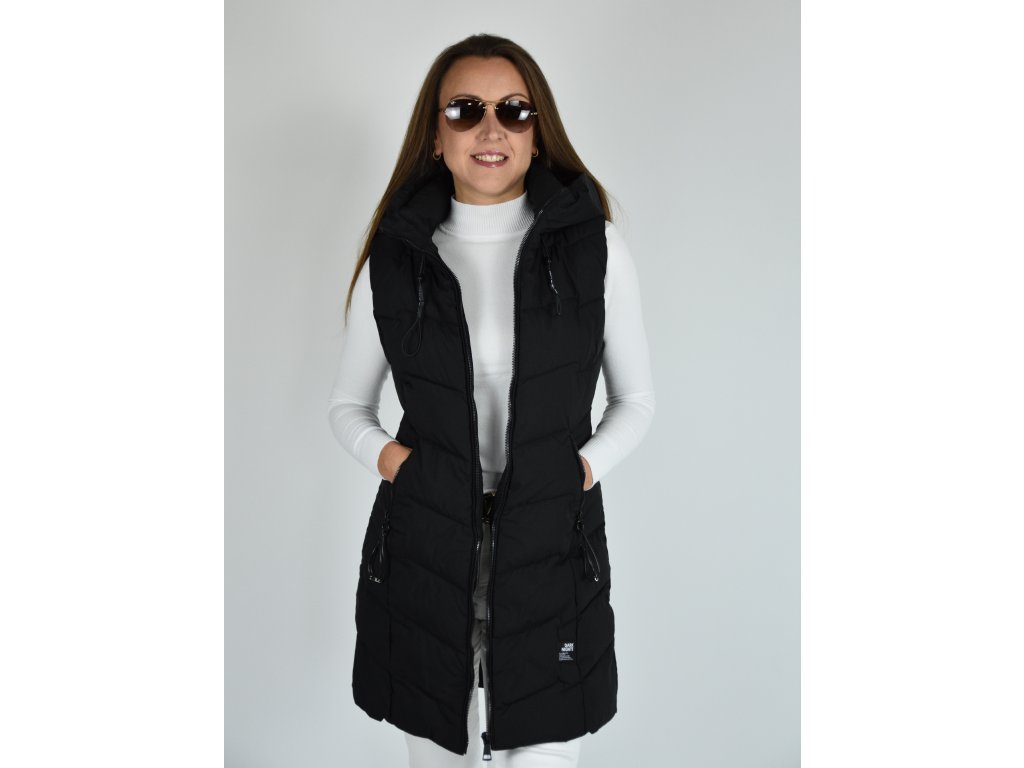 Černá dlouhá prošívaná vesta s kapucí 48042