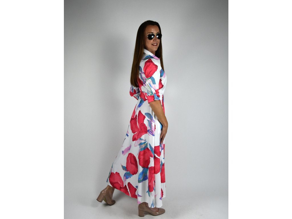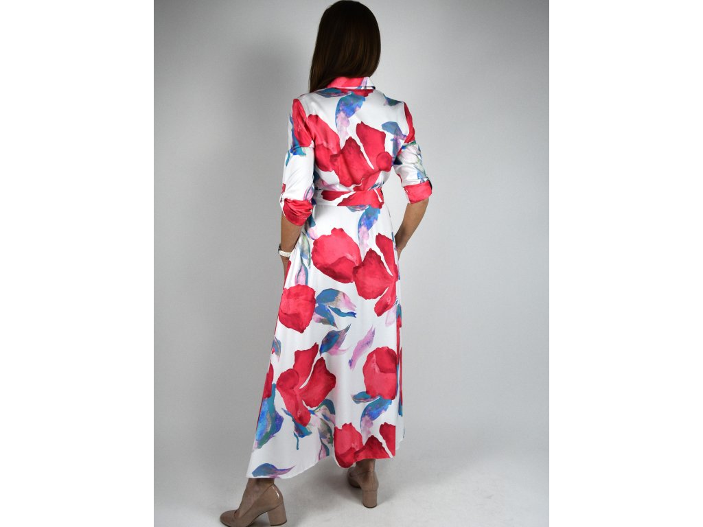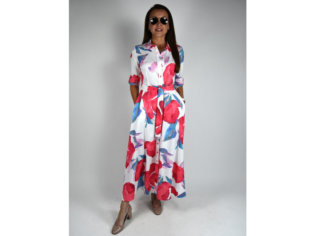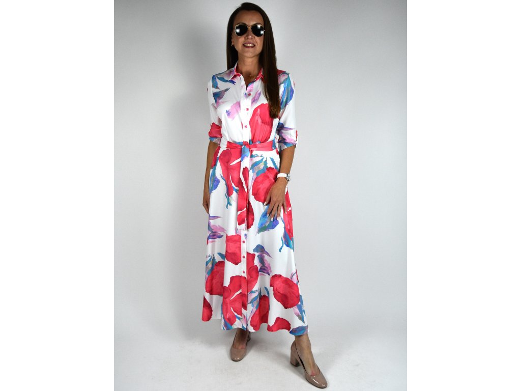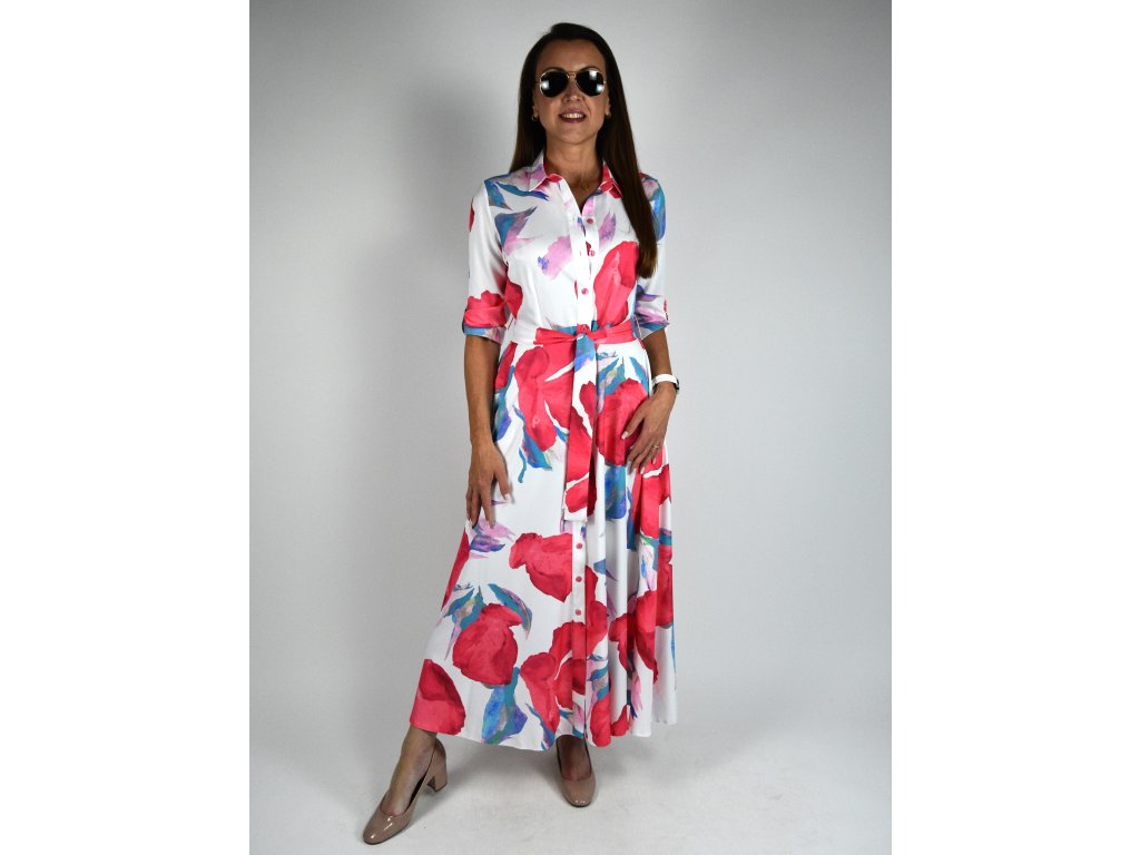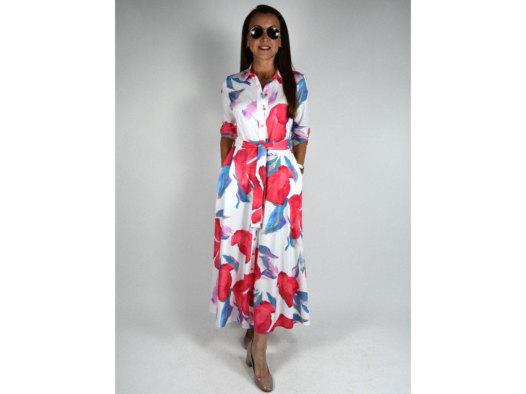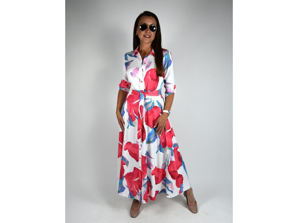 Dlouhé košilové šaty originální vzor - bílá, červená, modrá 0505