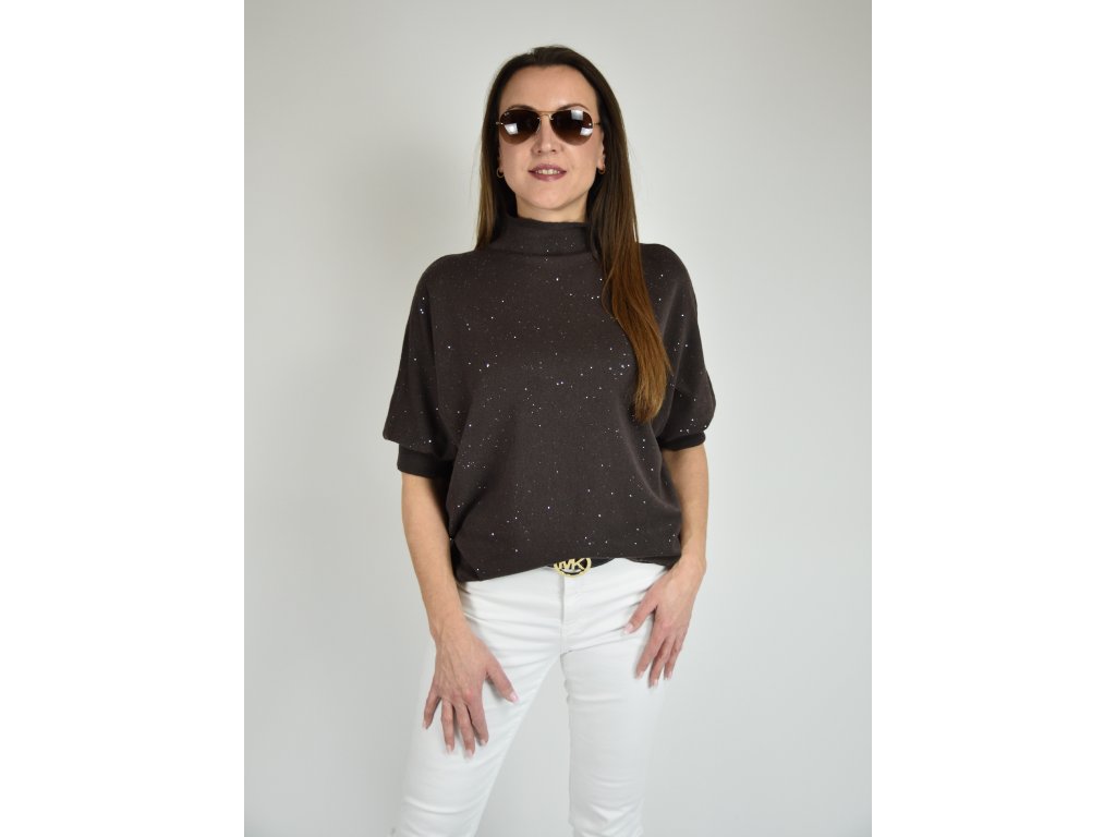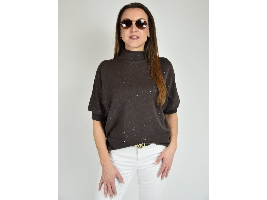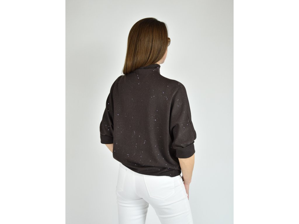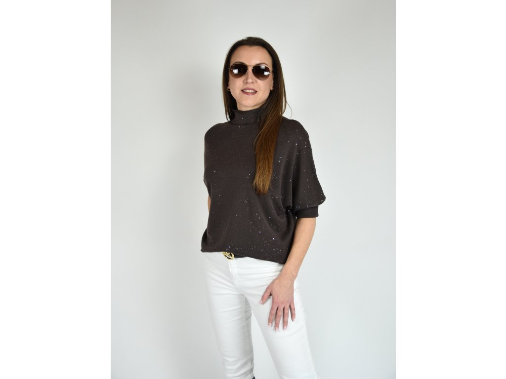 Hnědý třpytivý svetr s netopýřím střihem