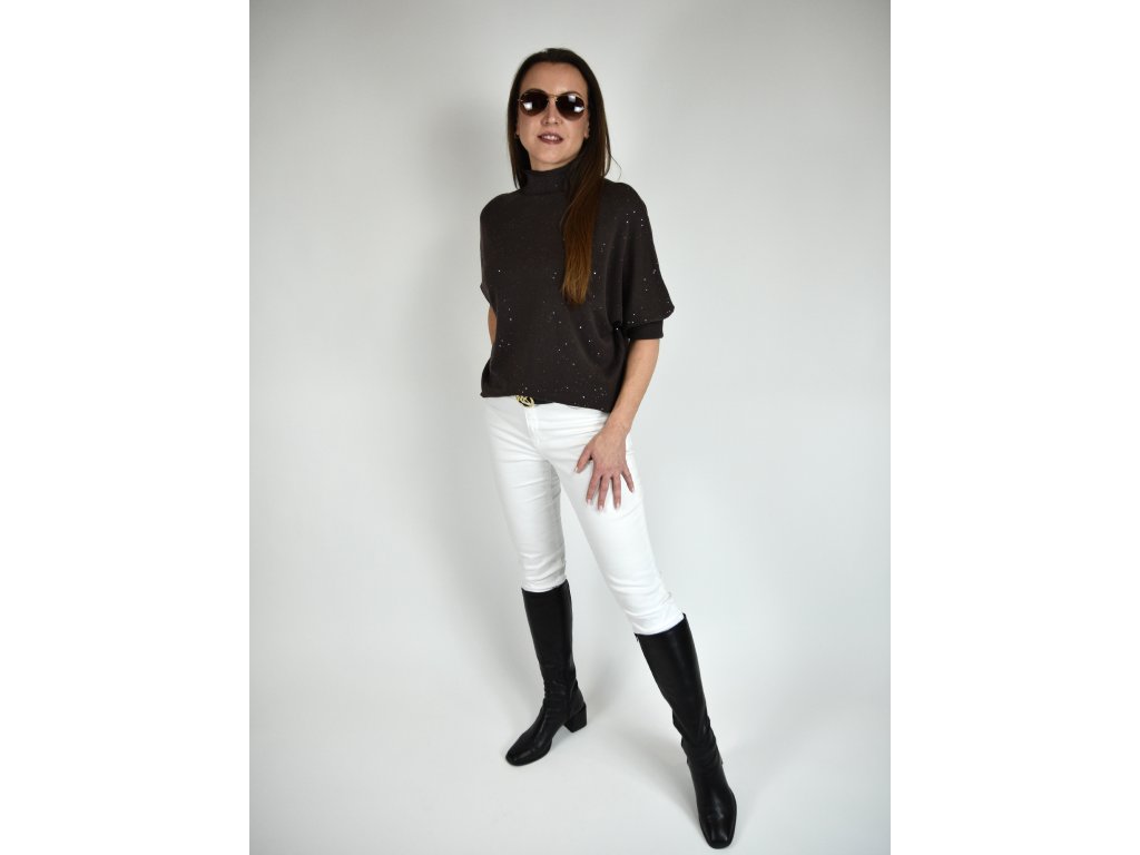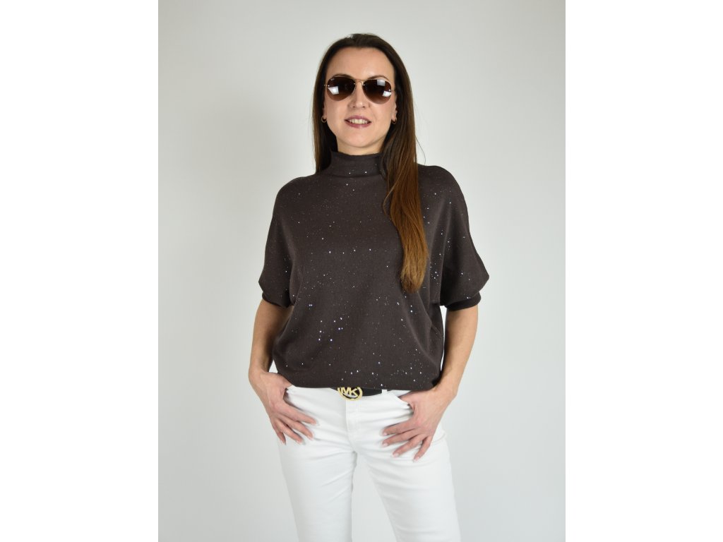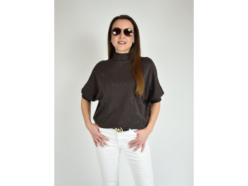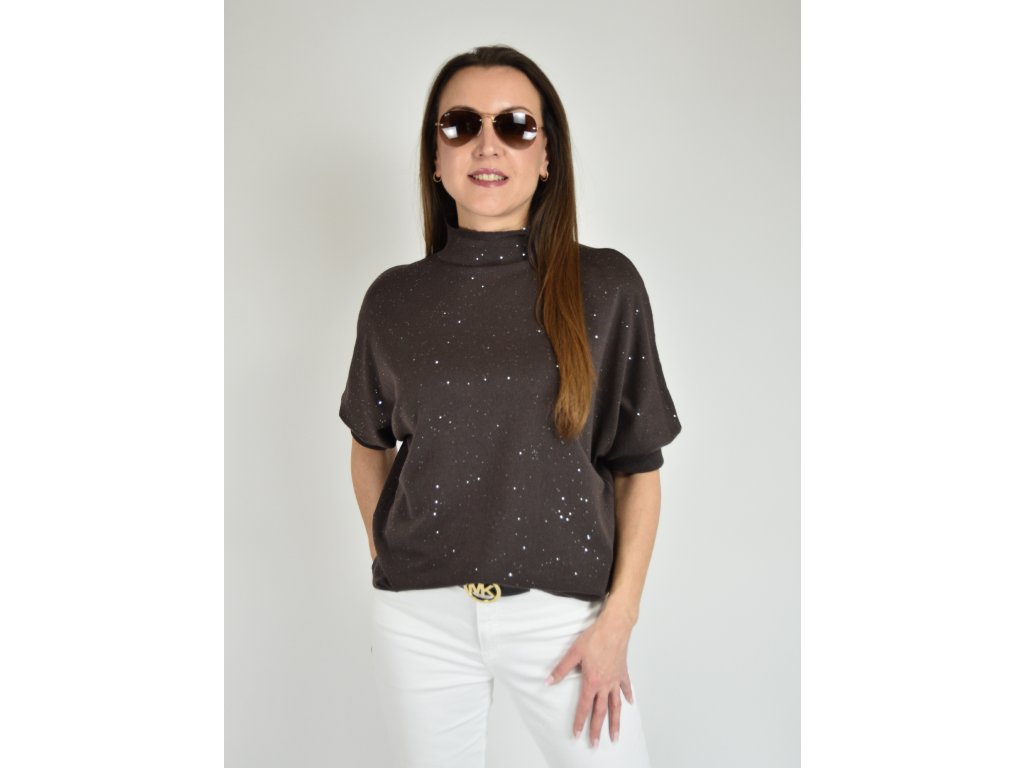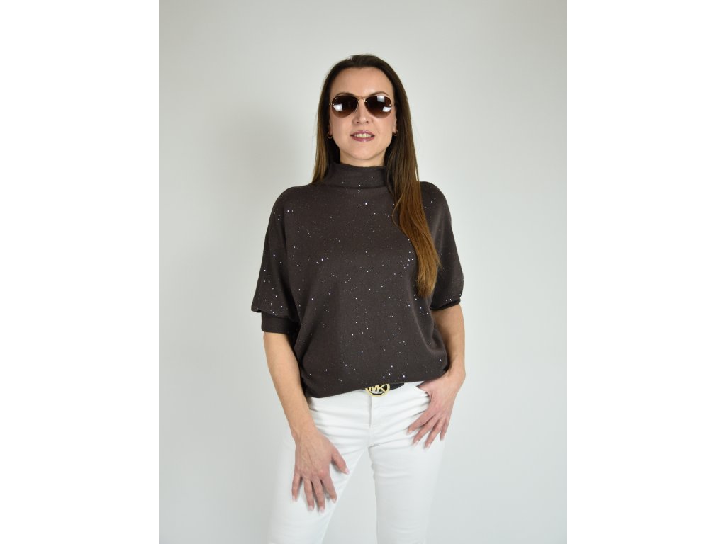 Hnědý třpytivý svetr s netopýřím střihem