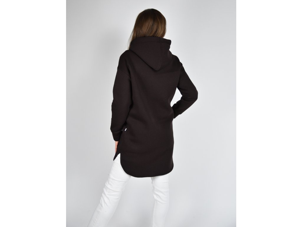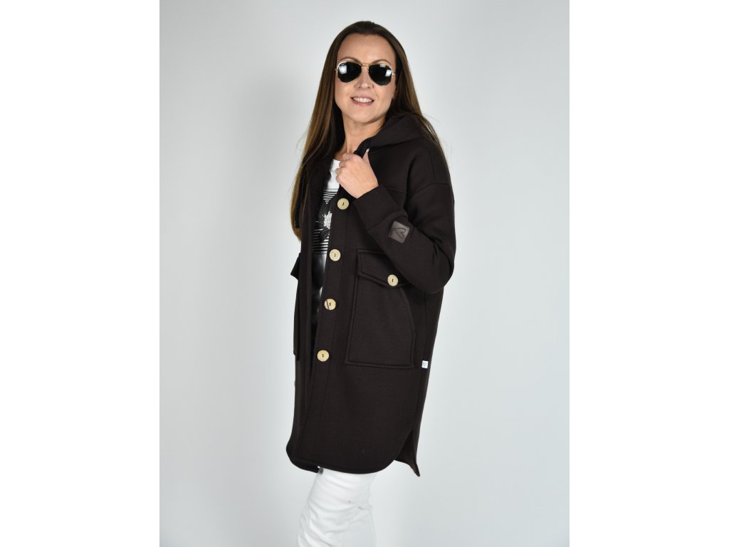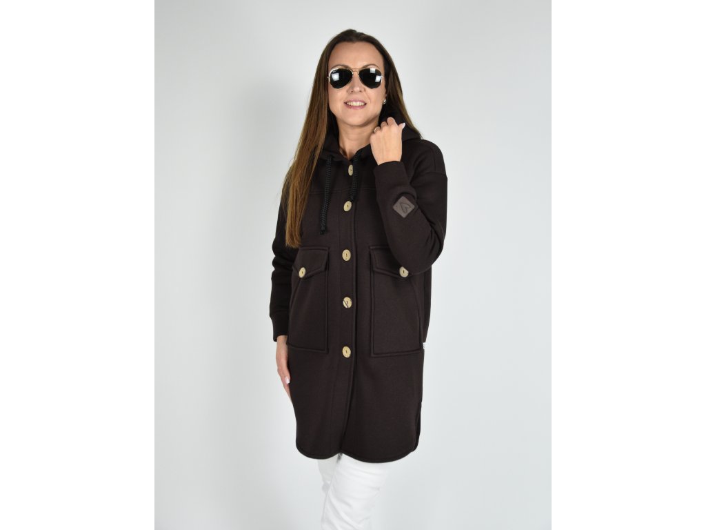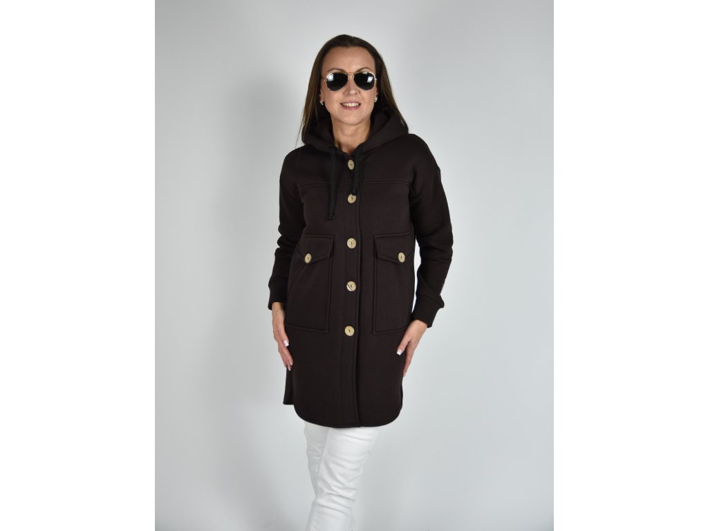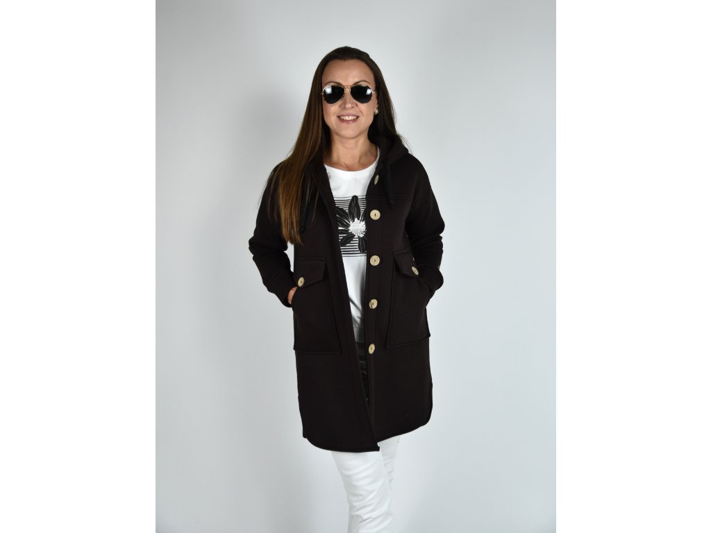 Tmavě hnědý kabátek Kropka s kapucí, kapsami a na knoflíky